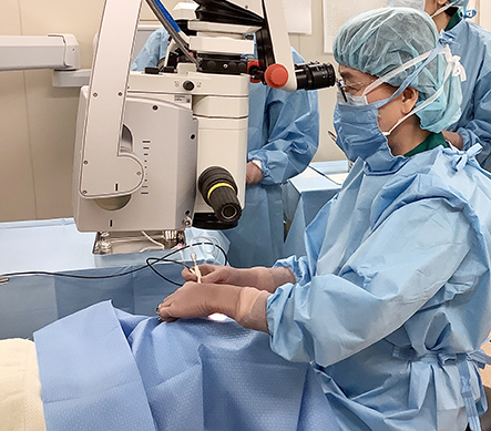 当院では涙目の原因の一つである、涙道閉塞に対して、内視鏡を用いた涙管チューブ挿入術を年間約80件、内視鏡検査を含めると約150件行っています。また、年に2回、涙道内視鏡手術のスペシャリストの先生とともに手術を行っています。